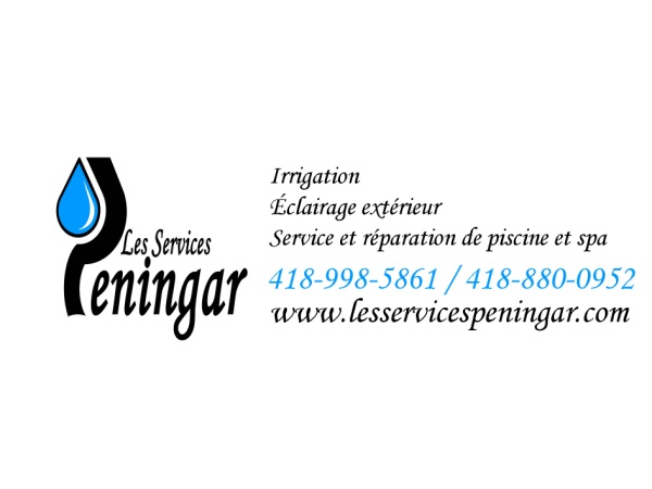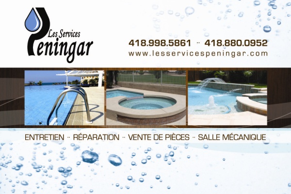 Les Services Peningar se spécialise dans le service et la réparation de spas (traditionnels ou encastrés) et de piscines (creusées ou hors-sol). Vente, service et installation d’accessoires pour spas et piscines :Cartouches ou sable de filtration, chauffe-eau électrique / propane / thermopompe, Système au sel, Système U.V.Ouverture et fermeture des piscines et des spas. Expertise des spas naturalisés et de bassins d’eau.Résolution de problèmes et remplacement de composantes pour spas et piscines :Réparation de systèmes électroniques, chauffe-eau, pompes, injecteur d’air, écumoires, jets, tuyauterie.Conception et réalisation de systèmes mécaniques personnalisés aux besoins de la clientèle, pour piscines et spas neufs ou pour remplacement mécanique complet des composantes existantes.